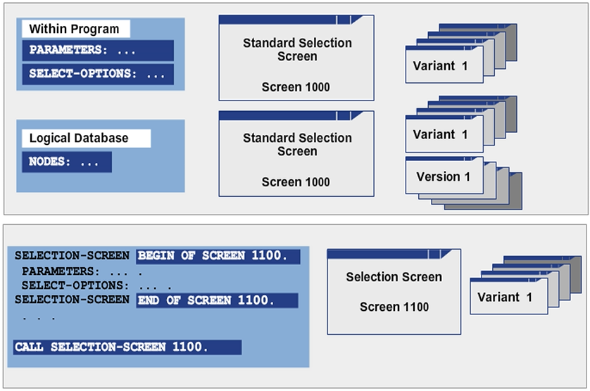 Logical databases supply a selection screen whose appearance is dependent on the specified nodes (NODES <name>).