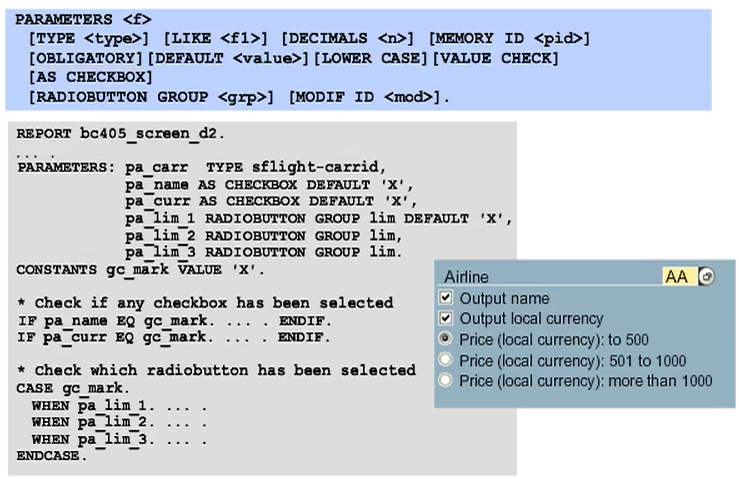 The PARAMETERS statement is a declarative language element. As in the case of the DATA statement, you can declare parameters with the TYPE or LIKE additions, and the system will then generate input fields on the selection screen.