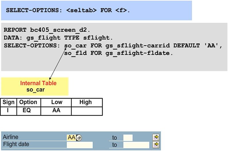 SELECT-OPTIONS is a declarative language element with the same naming restriction of eight characters as PARAMETERS. SELECT-OPTIONS allows the use of a value range and complex selections instead of a single input field.