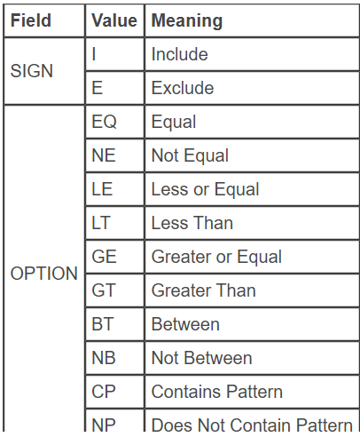 The selection set is a union of all includes (I1, ..., In) minus the union of all excludes (E1, ..., Em). If no values are entered into the SELECT-OPTION, the system returns all rows from the database.