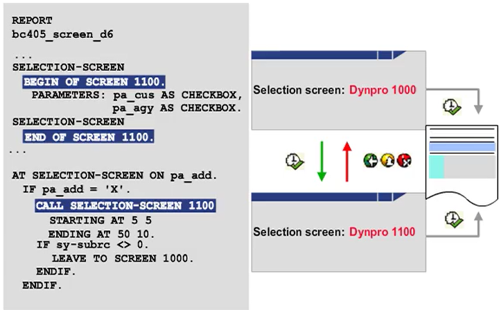 If the user performs any action on the called selection screen, the AT SELECTION-SCREEN event is processed. In this event, the sy-dynnr system field contains the number of the called selection screen. Then, the program continues with the statement that follows the call. The sy-subrc system field contains 0 if the user chooses Execute or presses F8. If the user chooses Cancel or Exit, sy-subrc contains the value 4.