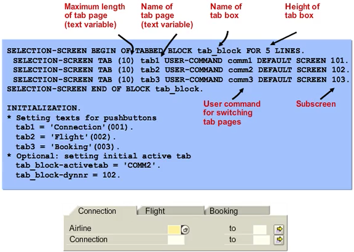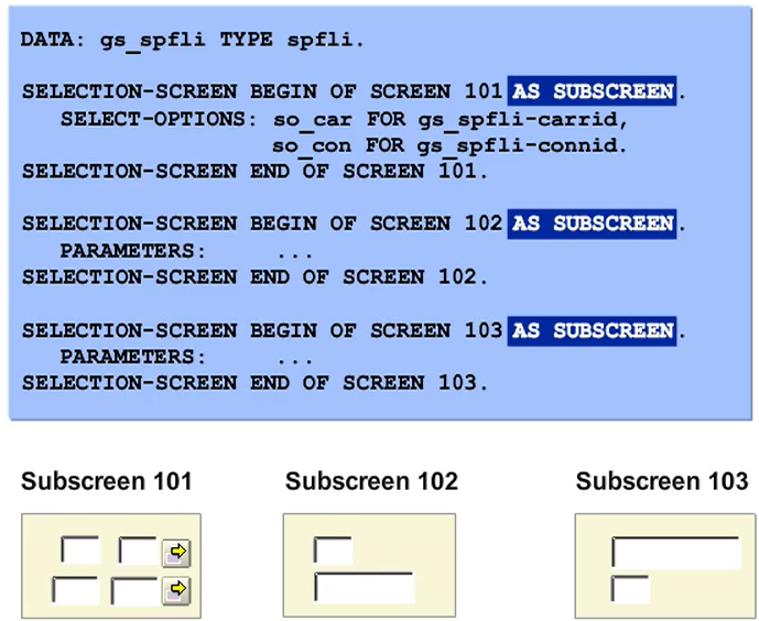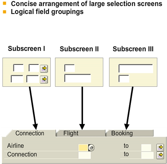 You can define selection screens as subscreens, and then include them on other screens as tabs. The system processes the AT SELECTION-SCREEN OUTPUT and AT SELECTION-SCREEN events for each subscreen and also for the surrounding selection screen.