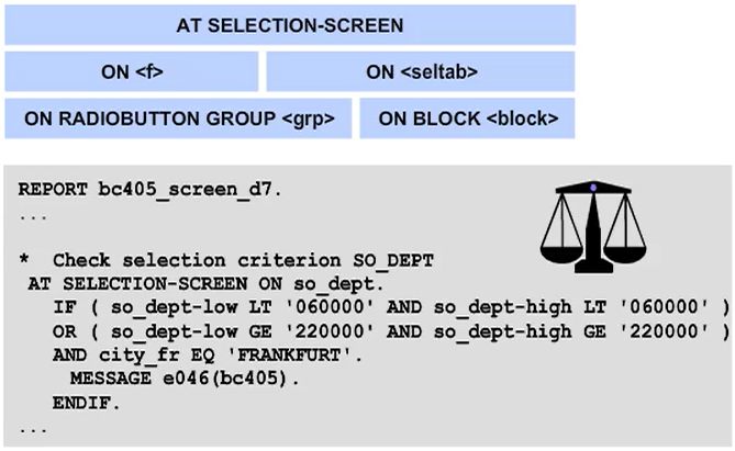 The AT SELECTION-SCREEN ON END OF event is triggered after the selection table has been fully passed to the program after a user action in the dialog box for the multiple selection has taken place. The entire selection table can be checked in this event block.