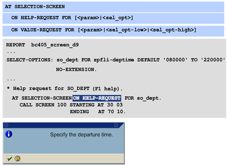 Hint: F1 and F4 help are usually stored in the ABAP Dictionary. This has the advantage that the programmer does not need to deal with the actual data retrieval for the input help, or the transfer of the selected value to the input field. For the user, F1 and F4 help of this type provide a uniform, cross-program design.