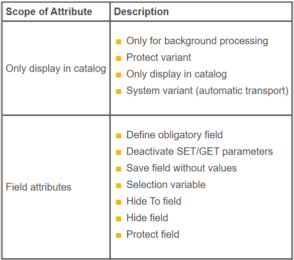 The type of a selection is defined in its declaration, for example, type S for SELECT-OPTIONS, type P for PARAMETERS. If you choose ->Selections protected, the fields are not ready for input. You use the ->Hide attribute to hide selections that are not required, making the selection screen clearer.