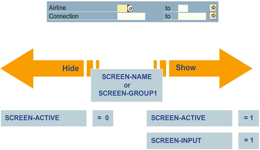 To hide selection fields, assign the value 0 to the SCREEN-ACTIVE attribute. You control the fields that are hidden using the name of the field or the group name.