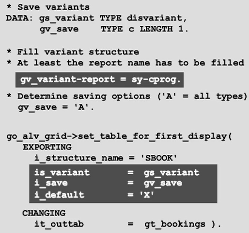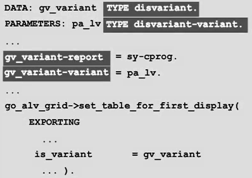 - Users can change the current layout variant and select existing variants. To set this mode, pass a structure of type disvariant to the is_variant parameter. Assign the name of the current program (sy-cprog) to the report field, and then, assign the value space to the i_save parameter.