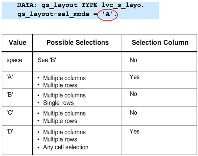 Depending on the value you enter in the sel_mode field in the layout structure, users can select individual or several lines or cells.
