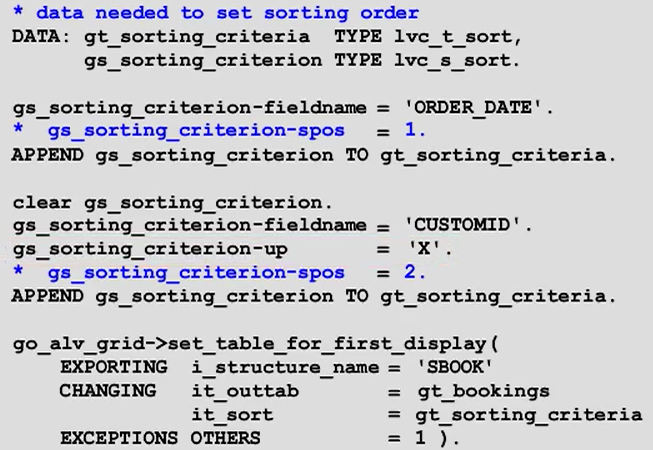 To sort data using sort criteria, enter the column name in the fieldname field. If you use more than one sort criterion, in each case, enter the sequence in which the sort criterion is evaluated in the spos field. Alternatively, you can also insert the fields in the required sequence in the internal table of sort criteria. Enter X in the up field if you wish to sort the entries in ascending order.