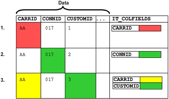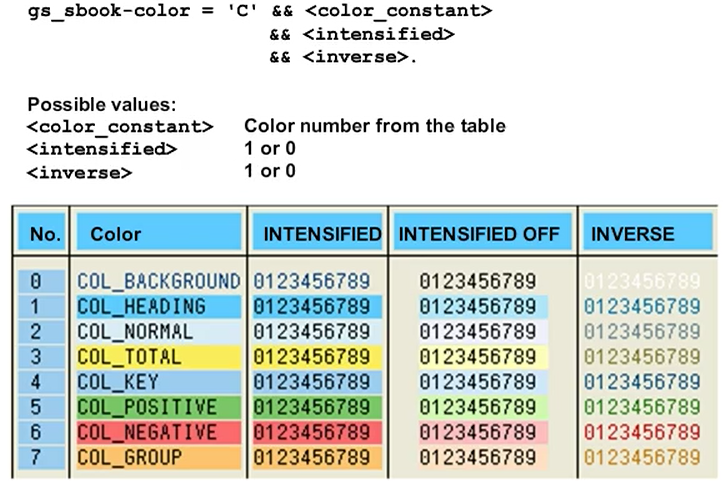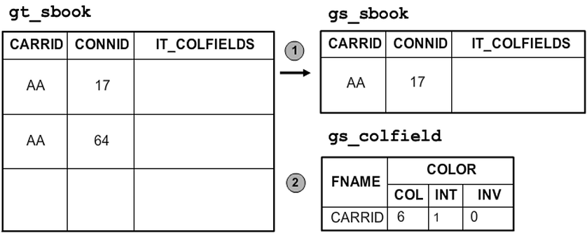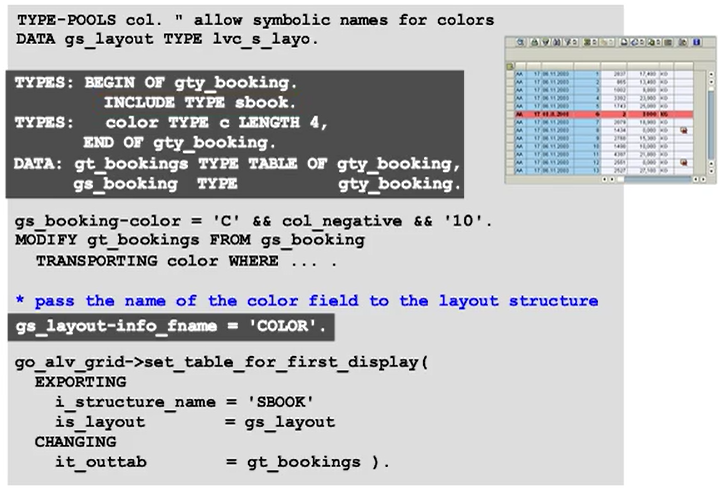 To highlight individual cells using colors, extend the line type of the output data table, adding an internal table of lvc_t_scol type. The contents of the internal table are not displayed; they contain information that controls the output.