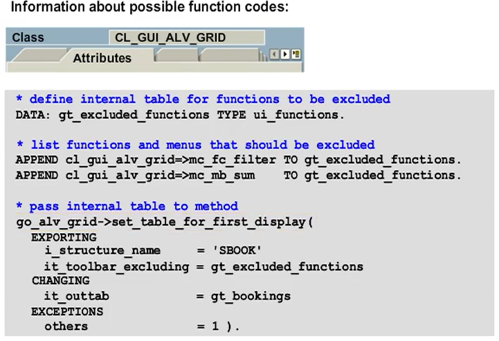 The possible function codes are defined as constants of the cl_gui_alv_grid class. The constants for function codes have the MC_FC_ prefix. The MC_MB_ prefix represents an entire menu in the toolbar.