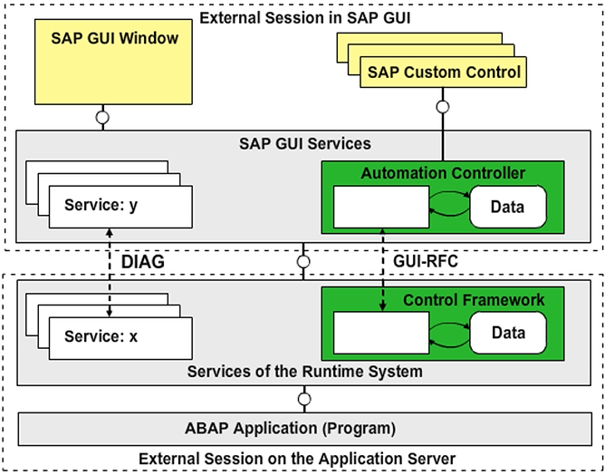 The CFW uses special services in the SAP GUI and the runtime system on the application server. These services are the automation controller on the presentation server and the CFW service on the application server.