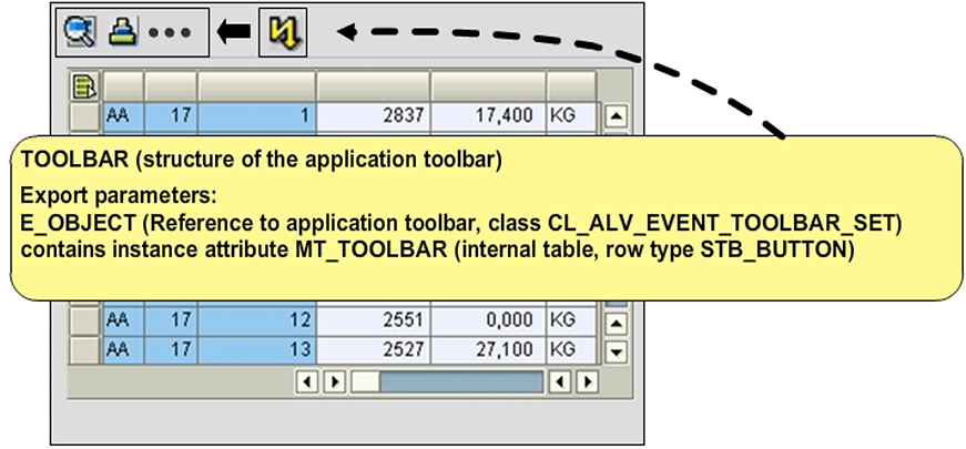 The toolbar event has a pointer to an instance of the cl_alv_event_toolbar_set class as an exporting parameter. This instance of a toolbar contains the public attribute mt_toolbar. This attribute is an internal table with line type stb_button. You fill this internal table in the handler method to add further buttons or other elements.