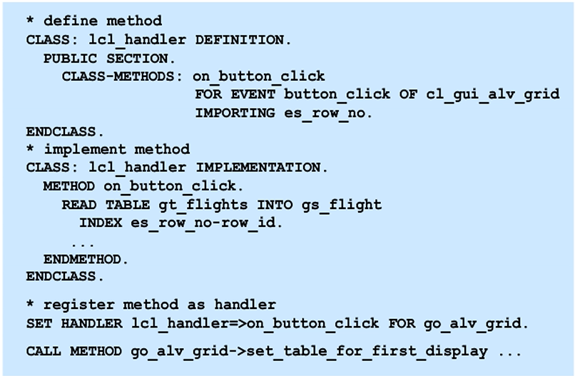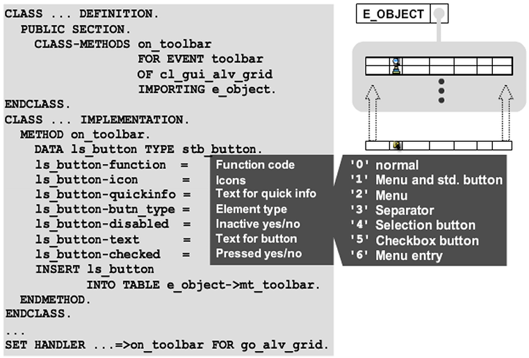 If the user chooses an element of the menu button or menu type, the representative instance triggers the menu_button event. This has a parameter e_object with type ref to cl_ctmenu. To add a menu to the toolbar, you must also implement a handler method in which you create the menu in the same way as a context menu.