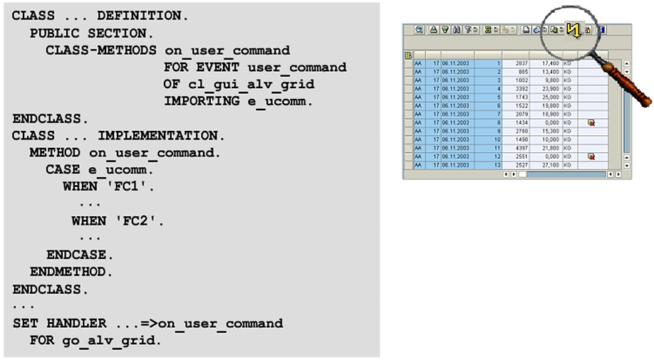If the user chooses a function element that has been added to the standard toolbar, the representative instance triggers the user_command event. This event contains the function code as its e_ucomm export parameter.