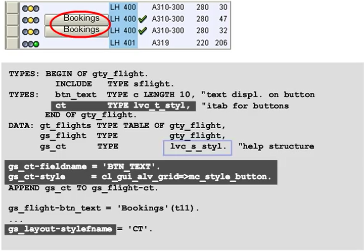 In the figure, a separate field (btn_text) is defined for the gs_flight structure in which a button is displayed (or not) depending on other data. You can also use the existing fields of the data structure if they do not have F4 help.