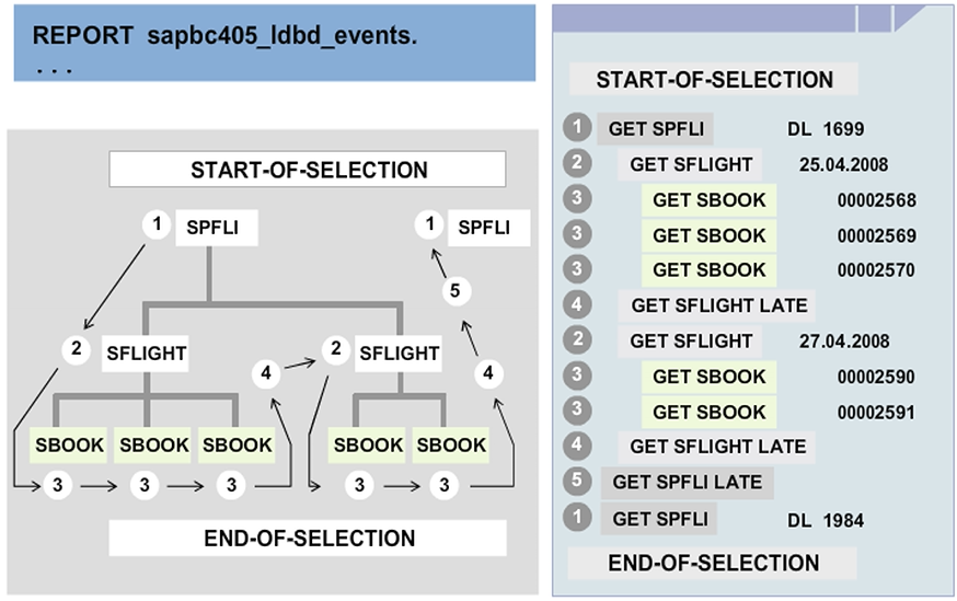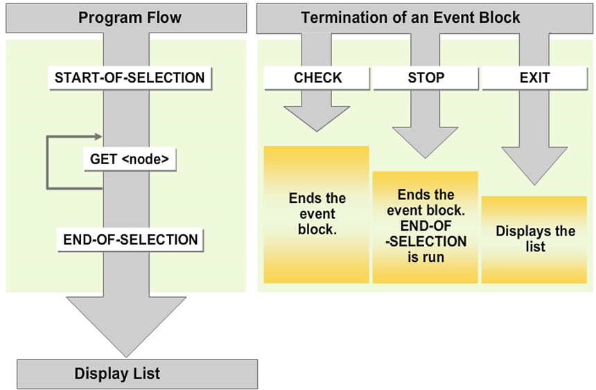 When an executable program is run, the system triggers the START-OF-SELECTION event before control is transferred to the read routine of the logical database. The END-OF-SELECTION event is triggered after all GET events are processed, which means after all data records are read and processed.
