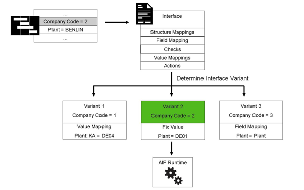 In this example the mapping for the company code is not done in the original mapping as three different Mappings are needed. Everything that is needed for all three senders is done in the regular definition and then a variant per sender is added that fills the company code following the different logics.