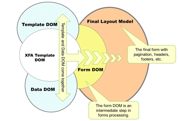 Several DOMs are participating in the form creation process, which is managed by the XML Forms Architecture (XFA) processor.