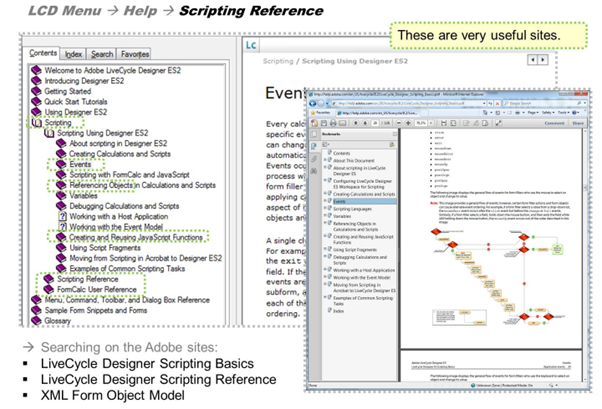 There are several important links to pages containing valuable documentation (XFA, DOMs, scripting, eventing, etc.):