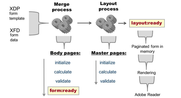 A Layout DOM is created from the Form DOM. It structures the form into pages and applies any other page-based rules such as page numbering, headers, and trailers.