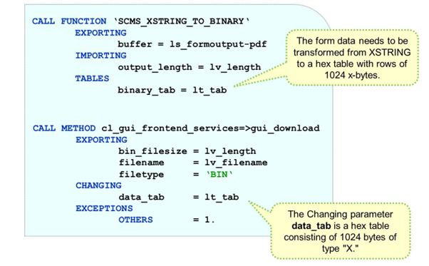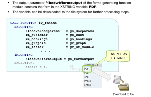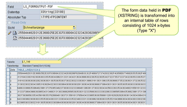 The importing formal parameter “/1bcdwb/formoutput” carries the PDF field. There, the PDF form is stored in binary format (as XSTRING).