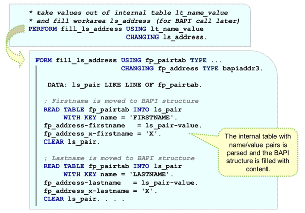 In this special example, the two-column table LT_NAME_VALUE is looped and all necessary fields are transferred to the LS_ADDRESS structure (type BAPIADDR3).