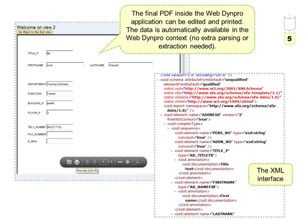 The XML-based interface is shown on the right side of the slide.