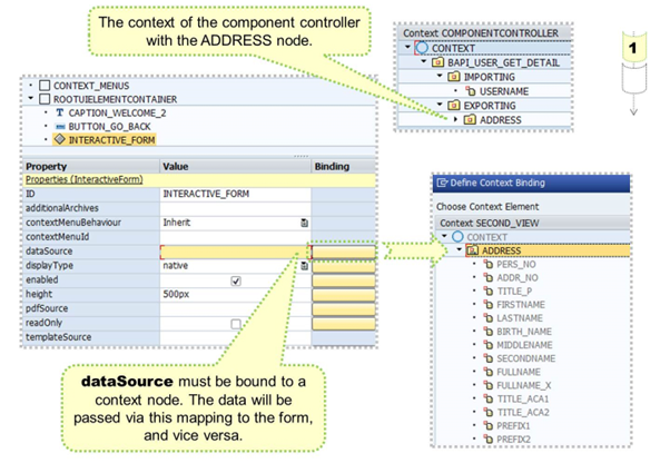 In this example, the context element ADDRESS is used. It holds the result parameters of the BAPI call and will pass the data to the Adobe form.
