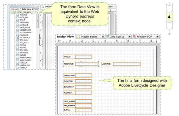 After associating the context element with the form interface, Adobe LiveCycle Designer appears and the layout of the form can be constructed.