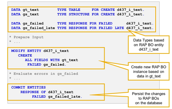 The actual creation of the new RAP BO instances takes place in EML statement MODIFY ENTITY, where d437_i_text specifies the (root) entity of the BO. The input for the create statement is provided by placing ABAP data object gt_text after addition WITH. (To simplify the example, we omitted the coding to fill internal table gt_text).