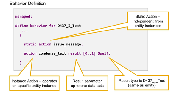 The behavior definition in the example defines two public actions: a static action and an instance action. The static action has no parameters at all. The instance action has a result parameter with cardinality [0..1] and the symbolic type $self. The type $self indicates that the result has the same type as the entity. The action can return up to one data sets of type D437_I_Text.
