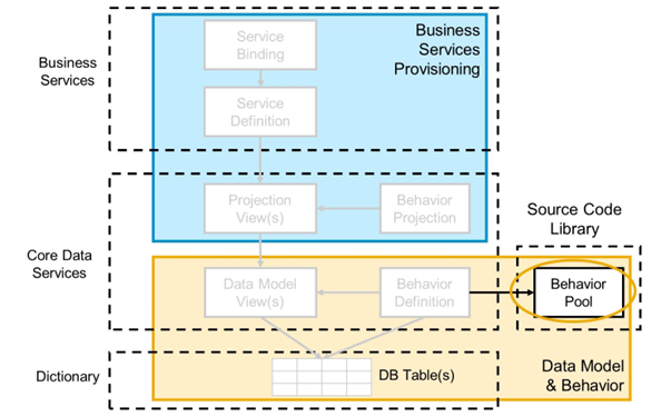 The transactional behavior of a business object in the context of the current programming model is implemented in one or more global ABAP classes. These special classes are dedicated only to implementing the business object's behavior and are called behavior pools. You can assign any number of behavior pools to a behavior definition. Within a single global class, you can define multiple local classes that handle the business object's behavior. The global class is just a container and is basically empty, while the actual behavior logic is implemented in local classes.