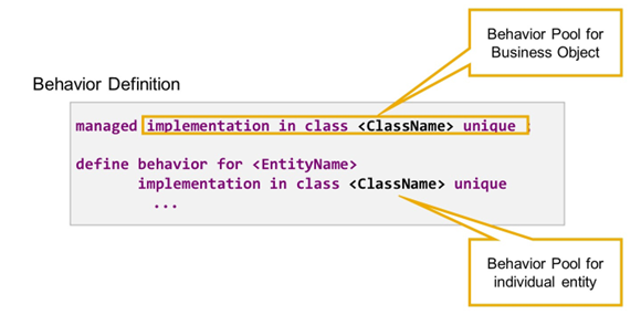 You specify a behavior pool for the RAP business object by adding implementation in class unique to the behavior definition header (statement managed or unmanaged). The mandatory addition unique defines that each operation can be implemented exactly once.