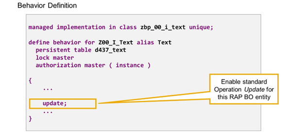 To include standard operation update in the OData service, add statement use update; to the entity behavior body (curly brackets after statement define behavior for … ). To disable the operation, remove the statement or turn it into a comment.