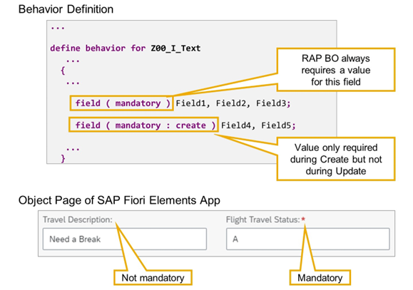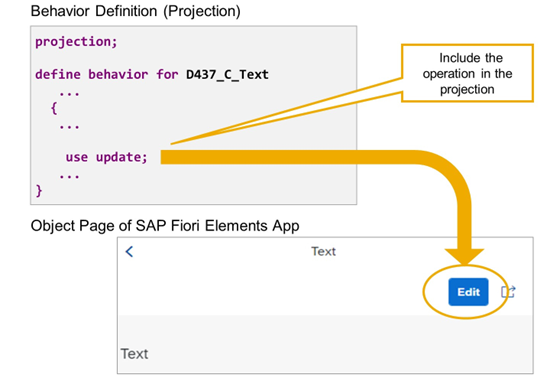 To include the field characteristics into the OData service, it is not necessary to add the field statements in the behavior projection. The related information is directly included into the OData Service. The SAP Fiori elements UI uses this information for UI hints, that is, depending on the operation, the fields will be displayed as editable or read-only.
