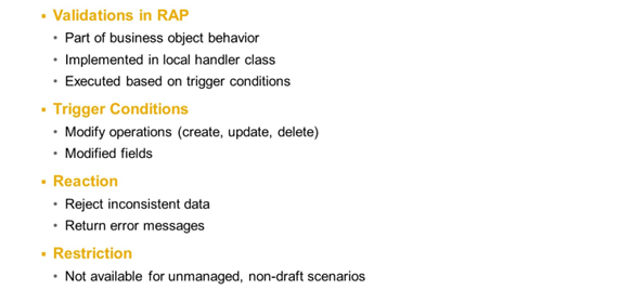 A validation is an optional part of the business object behavior that checks the consistency of business object instances based on trigger conditions. Validations, like actions, are defined in the behavior definition of the RAP BO and implemented in the behavior pool through a dedicated method of the local handler class.