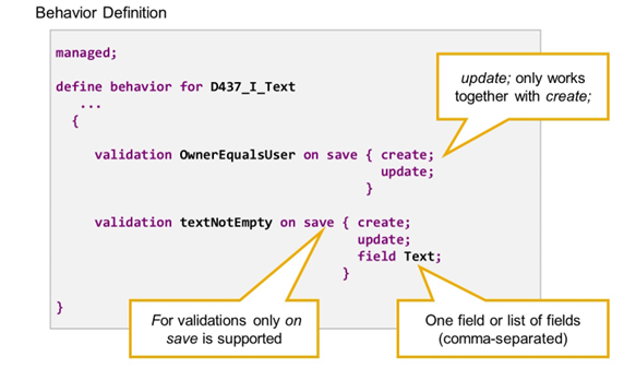The behavior definition in the example defines two validations. The first is triggered by any create or update operation. The other is triggered by changes to the field Text, either during a create operation or during an update operation.