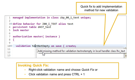 If the behavior pool already exists when you add the validation definition, you can use a quick fix to add the missing method to the local handler class. To invoke the quick fix, place the cursor on the name of the validation and press Ctrl + 1.