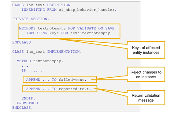 The implementation of a validation is contained in a local handler class as part of the behavior pool. This local class inherits from the base handler class CL_ABAP_BEHAVIOR_HANDLER.