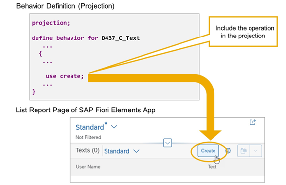 To make standard operation create available in OData and SAP Fiori, it has to be reused in the behavior definition for the projection view (behavior projection).