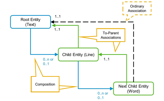 In the example, the hierarchy consists of three entities, the root entity (Text), its direct child entity (Line) and an indirect child entity (Word), which has the first child entity as its parent. The text is a composition of text lines and each line is a composition of words. For each of the two compositions, there is a corresponding to-parent association.