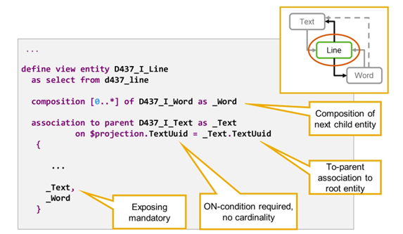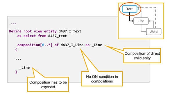 The root entity (D437_I_Text) serves as the source of a composition which is defined using the keyword COMPOSITION in the corresponding data definition. The target of this composition (D437_I_Line) defines the direct child entity.