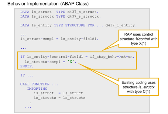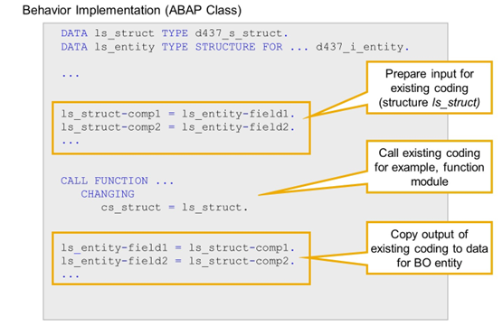 In the example, the existing code is a function module with a changing parameter. The parameter of this function module is typed with d437_s_struct, which is a structure type with components comp1, comp2, and so on. The RAP BO defines an entity d437_i_entity with fields named field1, field2, and so on.