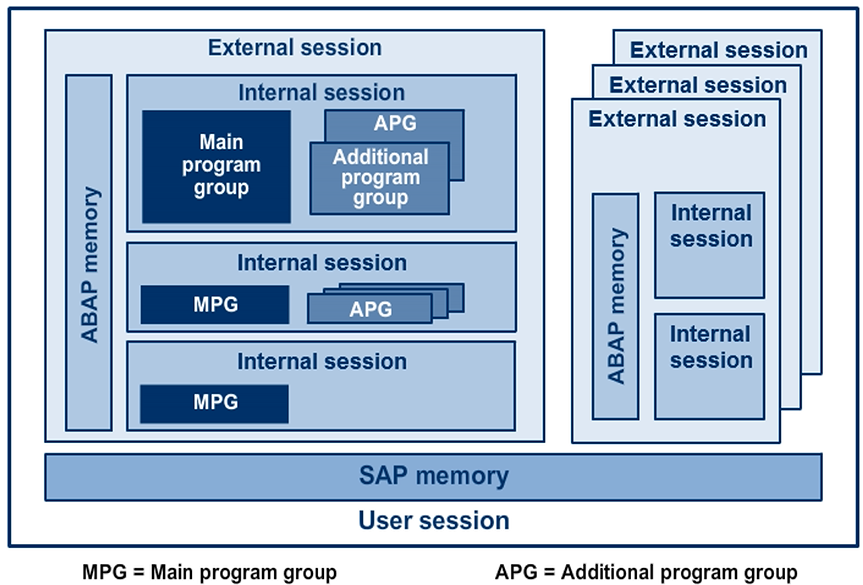 When a program calls external modularization units, the system loads the corresponding programs into the same internal session. The programs within an internal session form program groups. When the system opens an internal session with a program call, the system always creates the main program group. There can be one or more additional program groups. Each program group contains one main program, and possibly other programs as well.