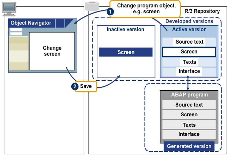 Saving an inactive version has no effect on the program LOAD. Accordingly, the syntax of the inactive version does not necessarily have to be correct. You can also save an interim, non-executable version of the development object inactively. However, the active version remains available as an executable version.