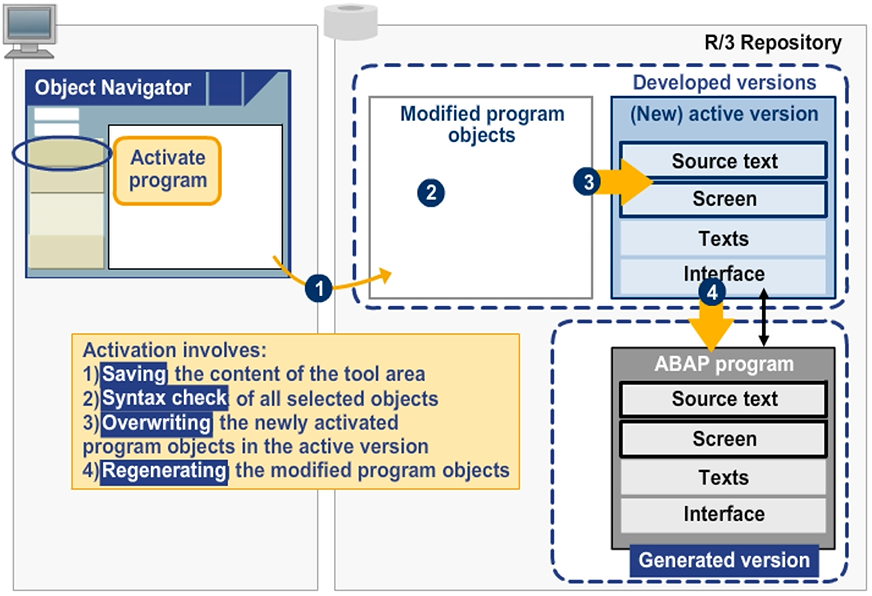 1. The object is saved, that is, a new inactive version is created. This is subject to a syntax check.