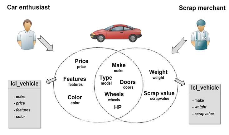 In a software context, abstractions are simplifications of complex relationships in the real world. You can abstract a real, existing object to the dimensions needed to simulate a certain section of the real world. In the figure, vehicles are used to explain the concept of abstraction. Software for a vehicle enthusiast and software for a scrap merchant contains different abstractions (classes) for objects. Therefore, depending on the type of abstraction, a class can contain different aspects of an object.