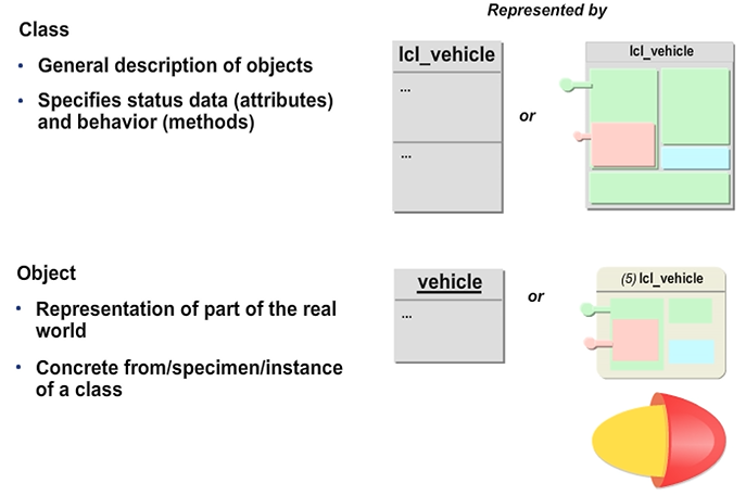 For example, the vehicle (make x, ..., model n), is an object of a class car. This object is a concrete instance of its class. Therefore, an object has an identity, a status (number of characteristic instances), and a behavior. The concepts of identity and status are different from one another.