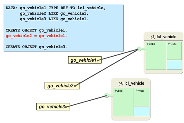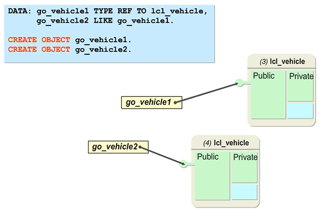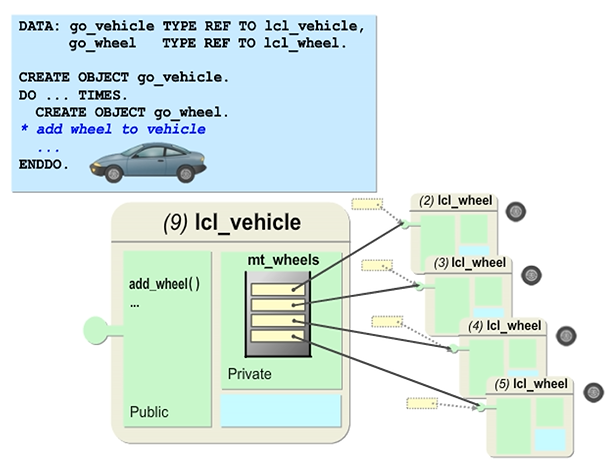 The objects in the class LCL_WHEEL have their own identity. You can create objects regardless of the existence of an object in the class LCL_VEHICLE. References are transferred to objects in class LCL_VEHICLE to create the desired association.